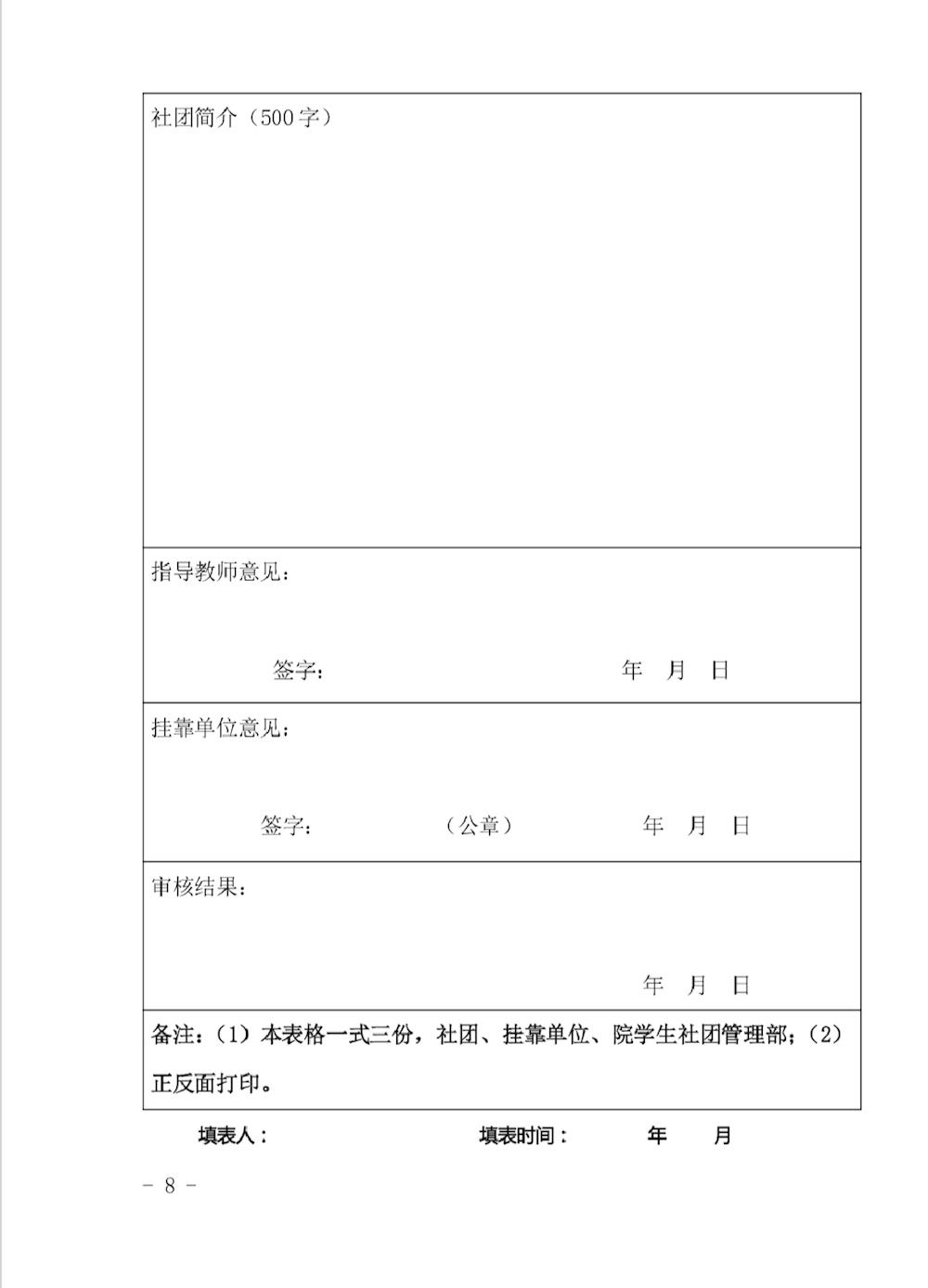 三、梳理学生社团基本信息,完成学生社团年度审核各团总支、各有关部门对照本通知要求,认真了解、梳理本单位挂靠学生社团情况,指导学生社团认真填写相关表格,根据学生社团2019年开展活动的实际情况,从遵纪守法、社团属性、活动情况、意义价值等方面进行严格审查,并对挂靠的学生社团做出“同意挂靠”、“整改后同意挂靠”和“不同意挂靠”等意见,对社团负责人做出评价,并将具体意见填入认定表相应栏目中,于2020年6月9日前将纸质版加盖公章交至团委张永星老师处。